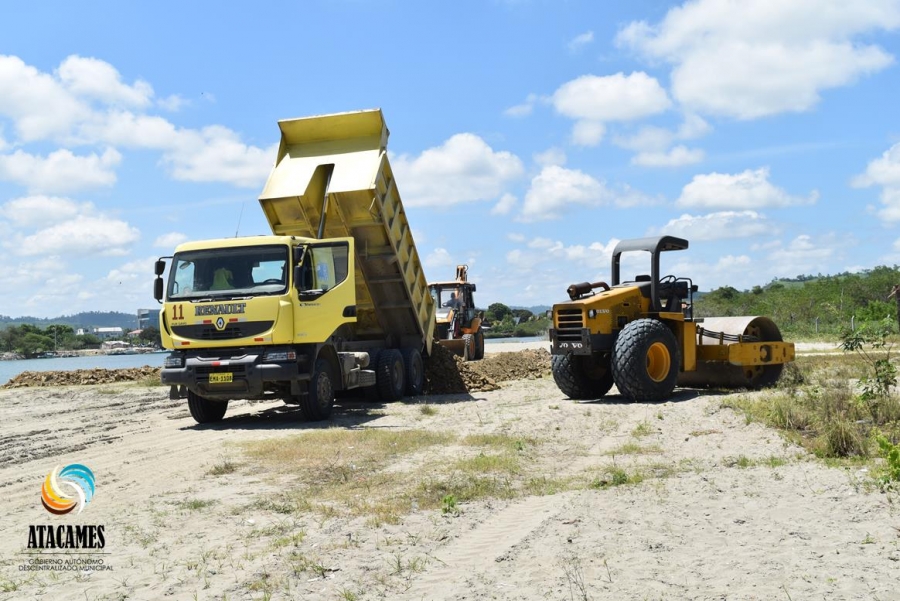 El sábado último, por disposición del Alcalde del Cantón Atacames Lic. Byron Aparicio Chiriboga, con maquinaria Municipal Atacames, se inició el mejoramiento del suelo de un tramo del sector La Bocana del Río Atacames, con la finalidad de reubicar a los emprendedores organizados en la Asociación Bocana de Atacames. El mejoramiento consiste en elevar el nivel del sitio para evitar inundaciones con motivo de aguajes y para ello se cascotea, riega, compactará el material y luego se lastrará el mismo. El Trabajo se cumplirá paralelo con otras actividades en otros sectores, a quienes también se debe atender manifestó el Director de Obras Públicas Municipal.