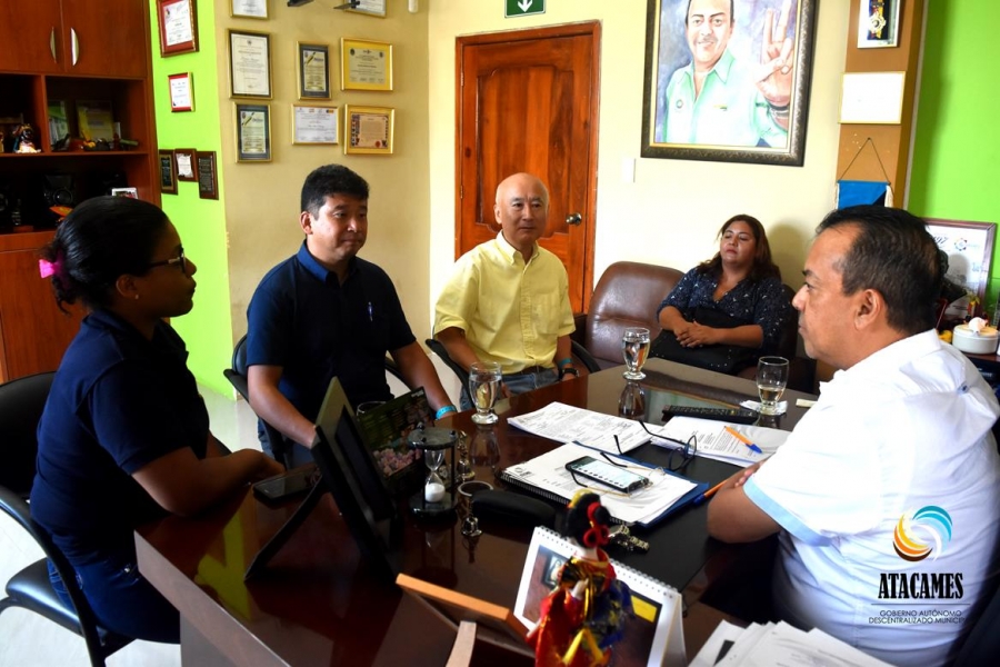 El Jefe del Proyecto JICA en Atacames, Sr. Satoru Tsukamoto acompañado del técnico Sr. Tomohiro Nishimura y de la traductora asignada a Atacames, dialogó con el Alcalde del cantón Atacames, Lic. Byron Aparicio Chiriboga, con la finalidad de agradecer la labor del Burgomaestre en beneficio del Proyecto de Construcción de Ciudades Resilientes a Sismos y Tsunamis y presentar nuevas propuestas de trabajo de concienciación para proteger a la Ciudadanía en casos de Tsunami. El Sr. Satoru Tsukamoto, Jefe del Proyecto JICA, expresó que en caso de emergencias hay varias alternativas para ubicarse en sitio seguro y no peligrar la vida de ciudadanos. Una de ellas, es que, se debe concienciar a la ciudadanía sobre el uso de viviendas o edificios de más de un piso de consistencia maciza para proteger a ciudadanos en caso de Tsunami.