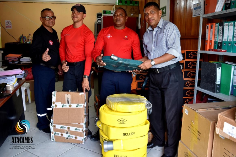Con la finalidad de solucionar la falta de mangueras destruidas por la concurrencia de asistencias a zonas con incendios forestales que destruyen implementos utilizados por los Bomberos, en la tarde de este miércoles, por disposición del Alcalde de Atacames Lic. Byron Aparicio Chiriboga, el Ing. Marcelo Bone Lozano, Guardalmacén Municipal Atacames procedió a entregar al Comandante del Cuerpo de Bomberos Municipal Atacames, 5 tramos de 15,24 metros de largo de manguera de 2.5 pulgadas para alta presión KEY FIRE. Un tramo de 1.5 pulgadas de la misma marca y de 15.24m y 3 tramos de 1 pulgada color verde de 15.24 metros. De esta manera se demuestra la preocupación del Alcalde de Atacames para que el Cuerpo de Bomberos de Atacames, pueda cumplir su ágil misión de ayuda solidaria a la colectividad sin contratiempos.