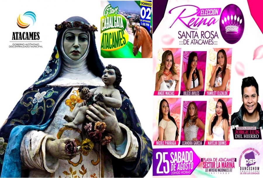 Están en circulación las invitaciones para los diversos actos programados con motivo de la Celebración de las Fiestas de Santa Rosa de Atacames. Hay invitaciones para el Pregón, Elección del Traje Típico, Romería al Monumento de Santa Rosa de Lima en el BY Pass, Elección de la Reina de Santa Rosa de Atacames, Rumbeque en la Playa de Atacames, el sábado 25 en la mañana y tarde, Cabalgata el domingo 2 de septiembre. Feria